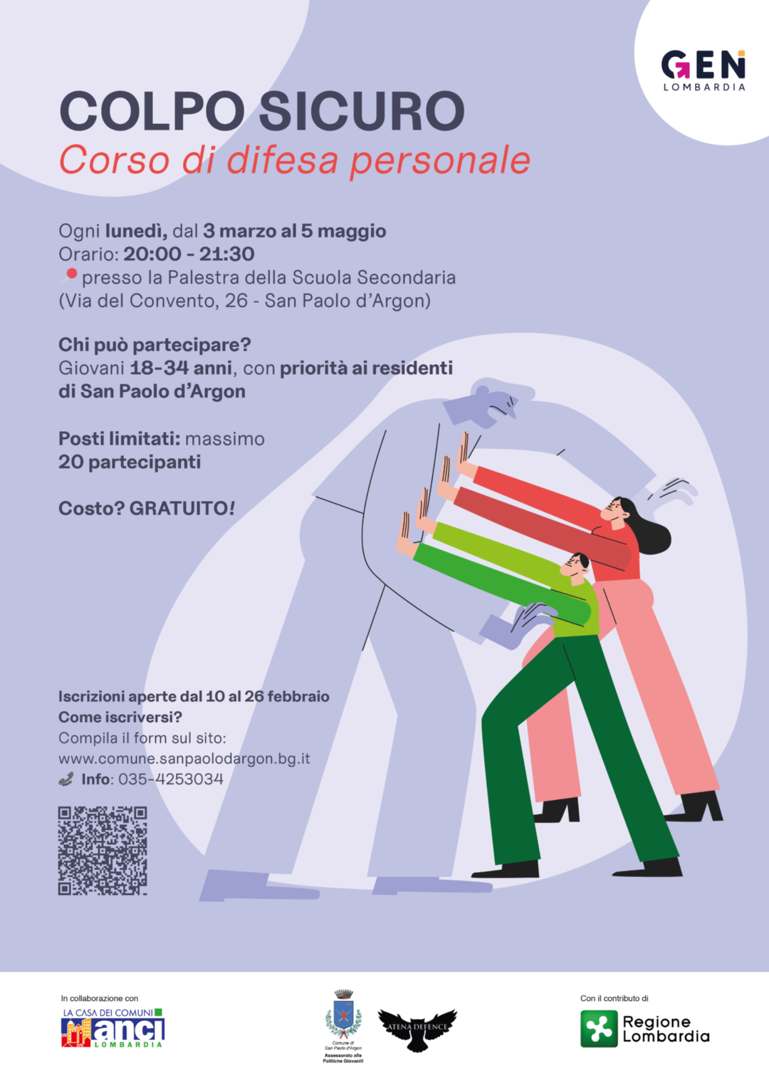 L'Amministrazione Comunale propone in collaborazione con l'associazione sportiva ATENA DEFENCE ASD un corso di difesa personale per ragazze e ragazzi di età compresa tra i 18 e i 34 anni.