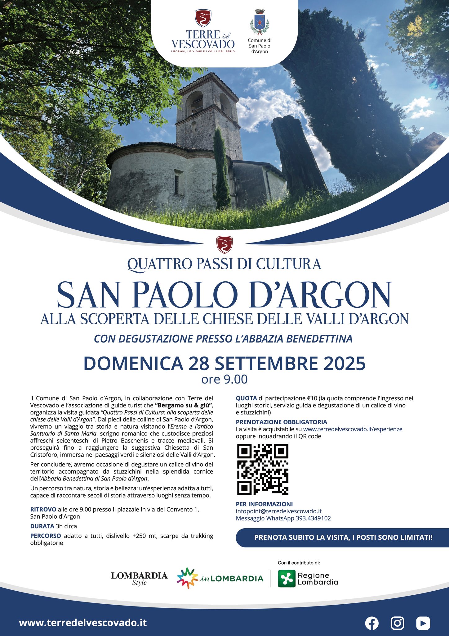 Il Comune di San Paolo d'Argon, in collaborazione con Terre del Vescovado e l'associazione di guide turistiche "Bergamo su & giù", organizza la visita guidata "Quattro Passi di Cultura: alla scoperta delle chiese delle Valli d'Argon". Dai piedi delle colline di San Paolo d'Argon, vivremo un viaggio tra storia e natura visitando l'Eremo e l'antico Santuario di Santa Maria, scrigno romanico che custodisce preziosi affreschi seicenteschi di Pietro Baschenis e tracce medievali. Si proseguirà fino a raggiungere la suggestiva Chiesetta di San Cristoforo, immersa nei paesaggi verdi e silenziosi delle Valli d'Argon. Per concludere, avremo occasione di degustare un calice di vino del territorio accompagnato da stuzzichini nella splendida cornice dell'Abbazia Benedettina di San Paolo d'Argon.